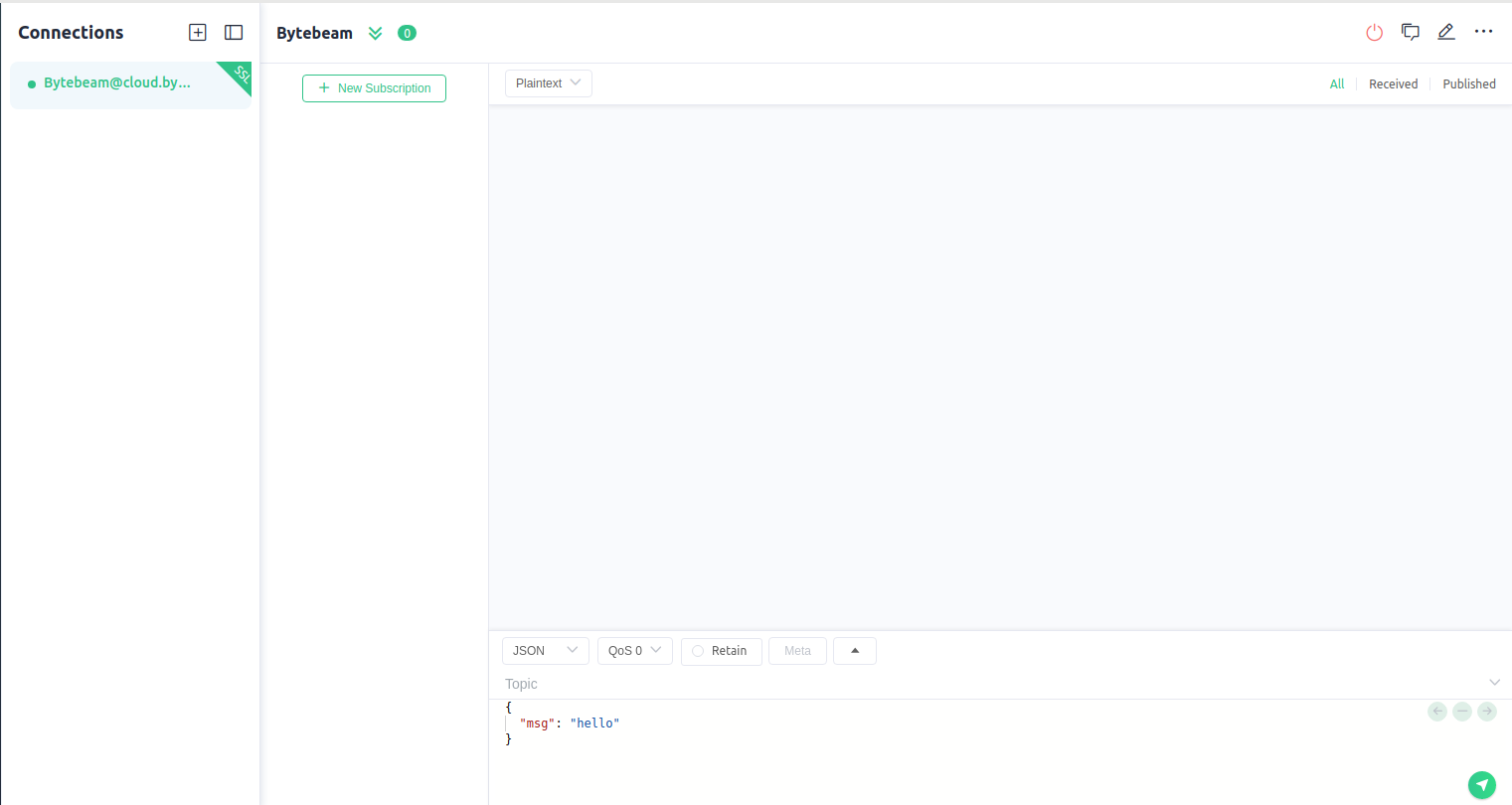 - Note that bytebeam expects each device to present a unique MQTT client id. e.g. you can construct the client id as “client-<tenant-id>-<device-id>”.