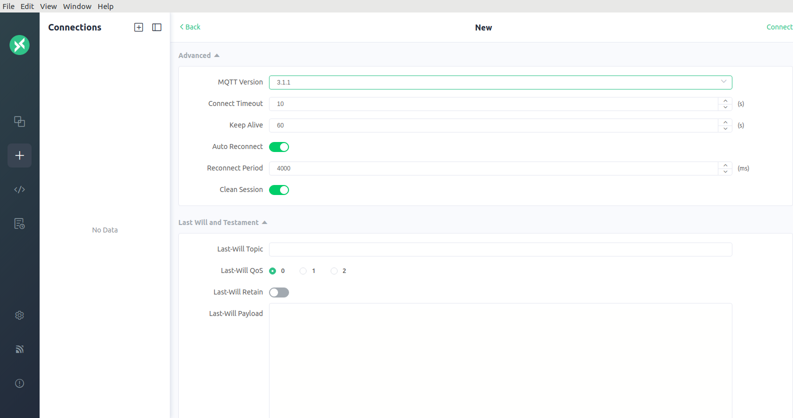 Now open MQTTX and click on+ New Connection to create a new connection: