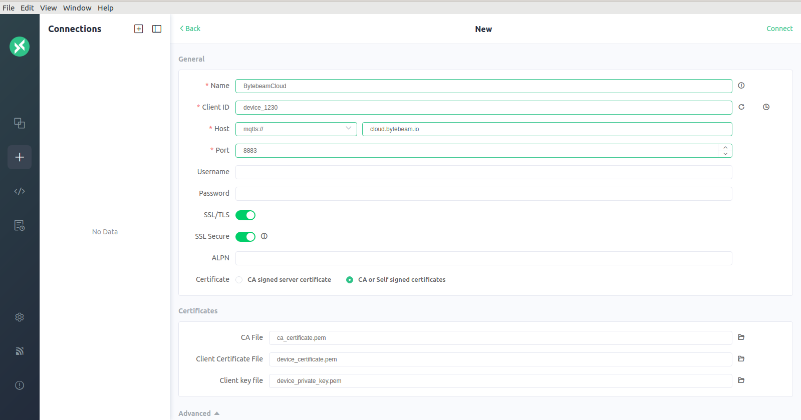 ca_certificate, device_certificate and device_private_key into three files. We will connect to Bytebeam cloud using these files and MQTTX. Note the “\n” characters in the strings. When extracting these into individual files we need to replace them with newlines. Here is how the three files would look like