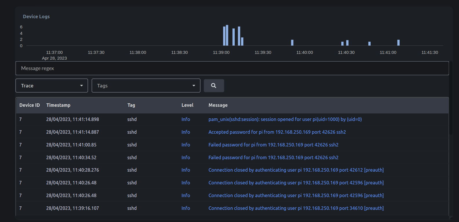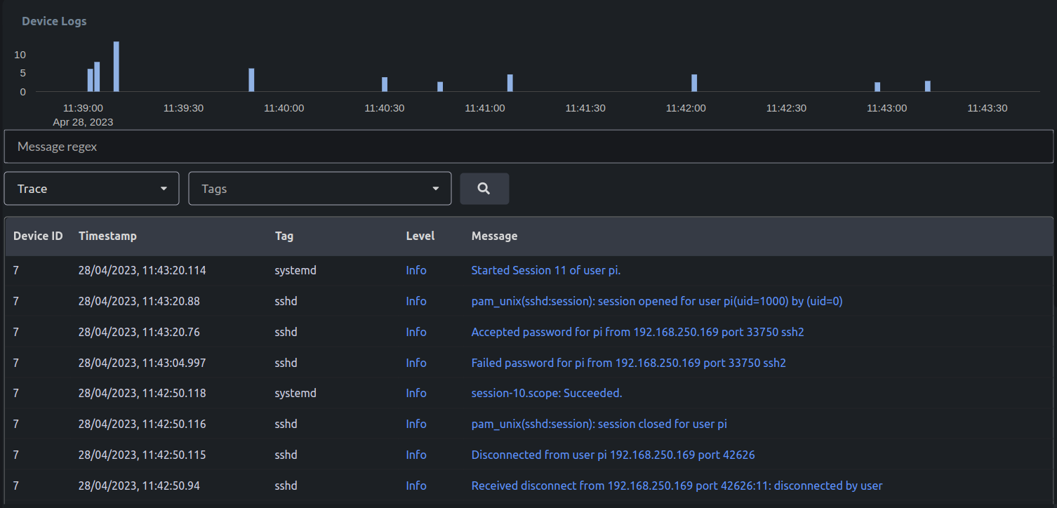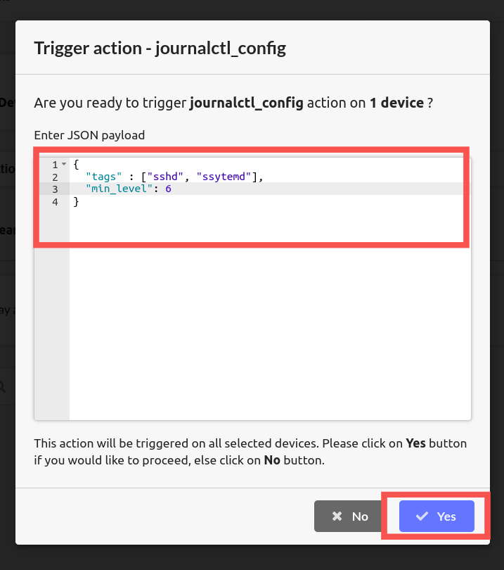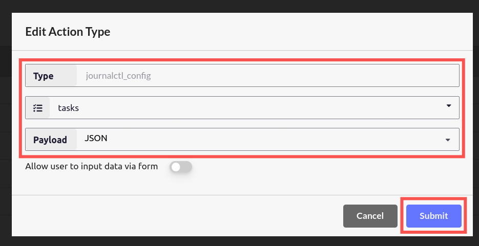 With the help of config.toml file, we can filter the logs related to a particular process. In this example, we see logs related to ssh. It is possible to change the logging configuration, from the cloud as well. To do that, we need to create a new Action type called “journalctl_config”. Follow the guide on Creating new Action Types. “journalctl_config” is internally handled by uplink itself. It manages log level and tags Click on Submit.
