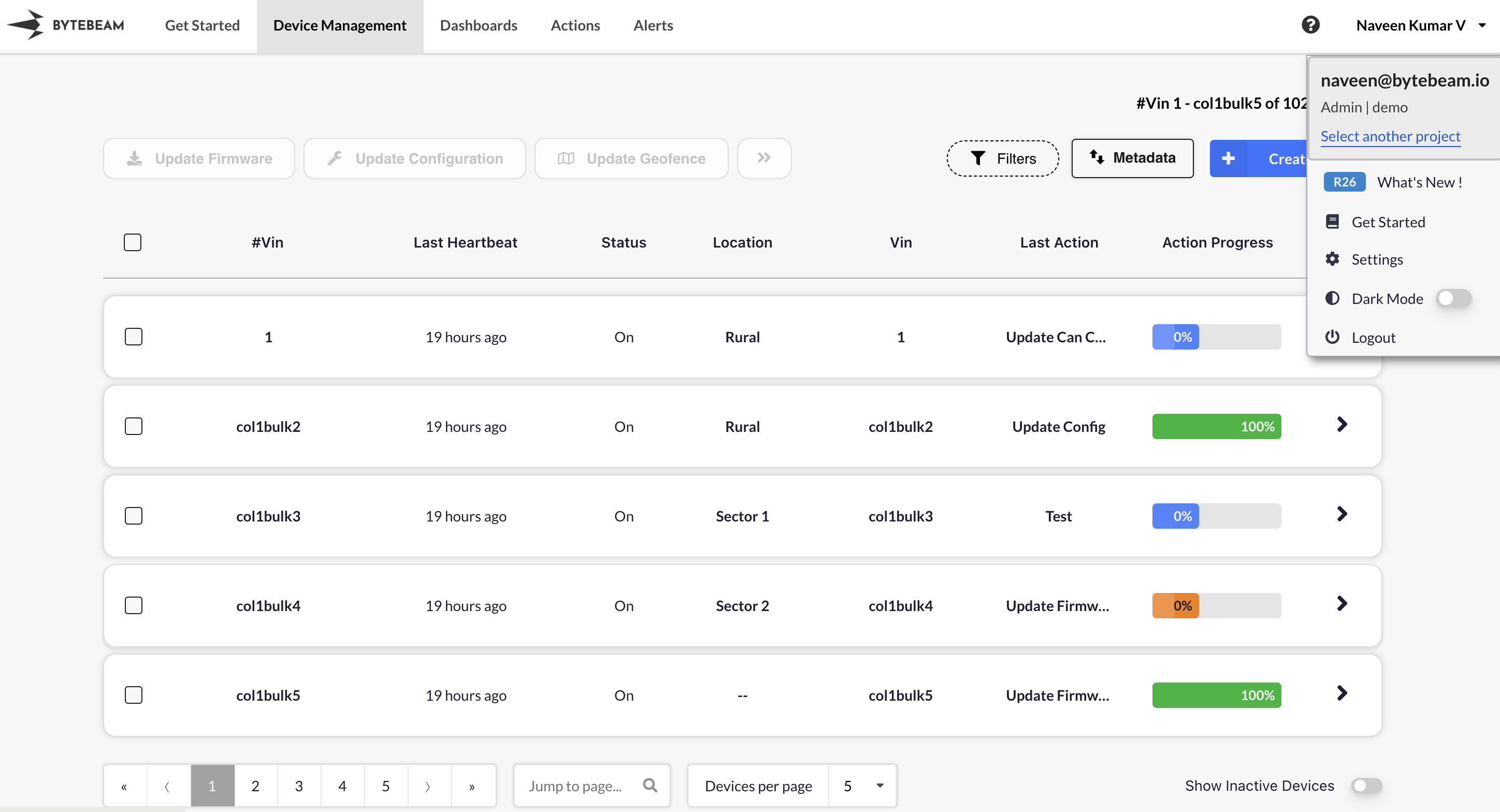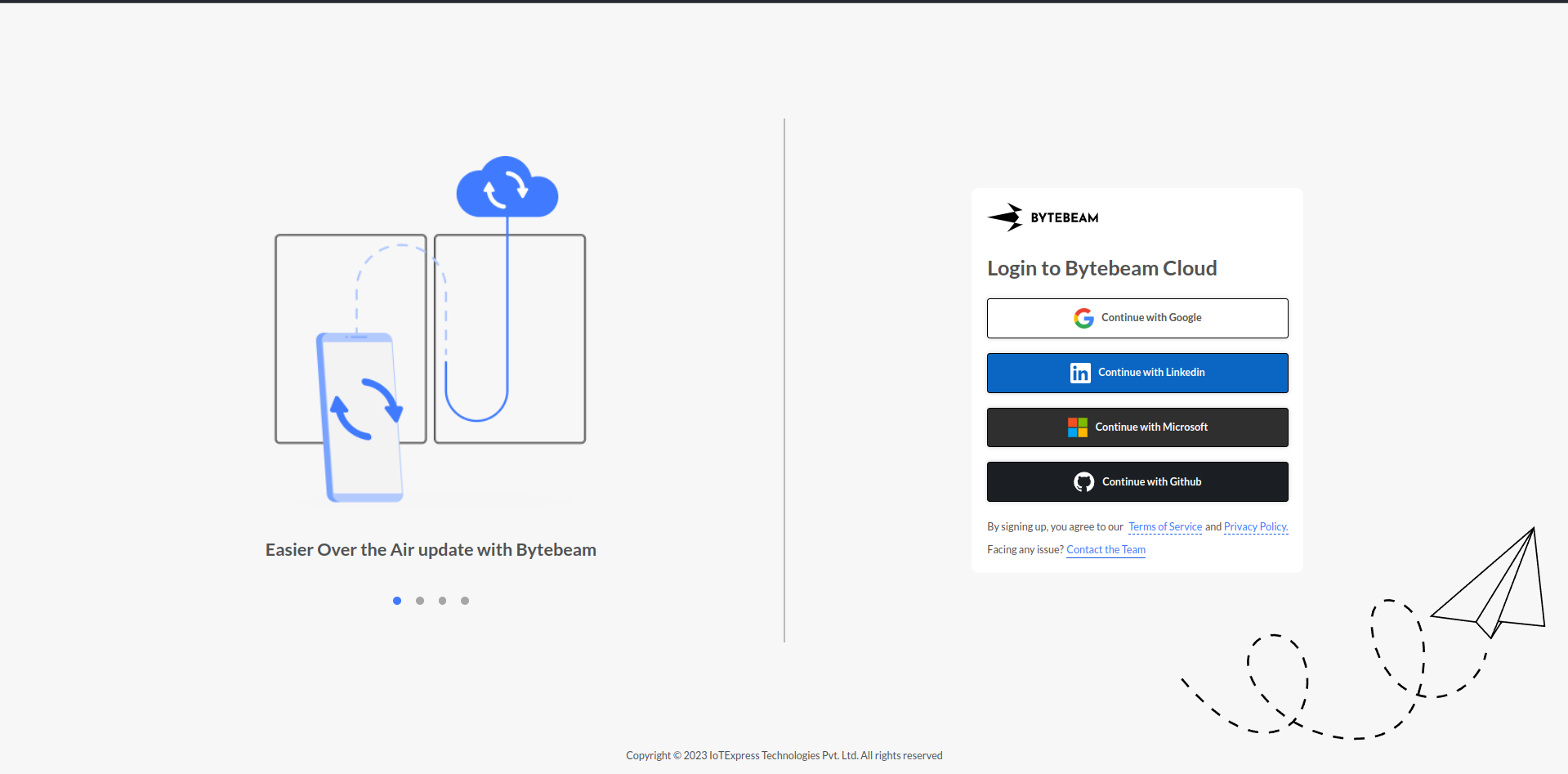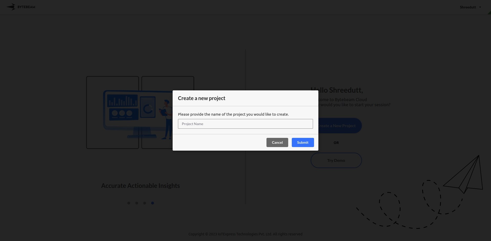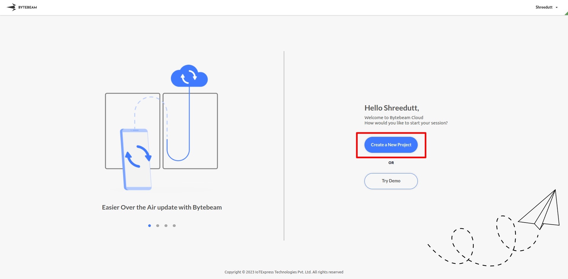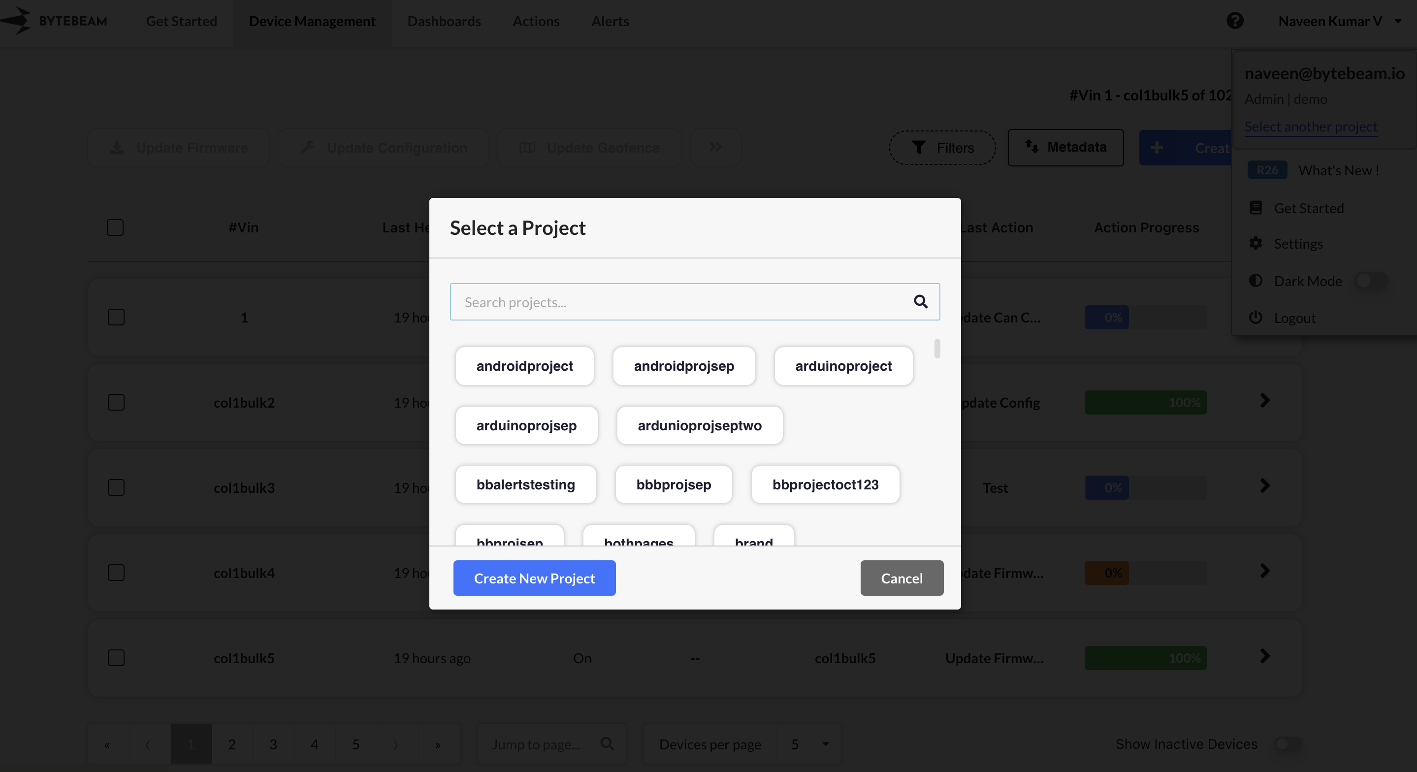 Upon logging in, you may encounter one of the following scenarios:Existing Project: If you already have a project, you will be directed to the Device Management page for that project.No Project Created: If no project exists, you’ll see a Welcome screen that suggests you to either create a new project or try the demo of the Bytebeam console.Multiple Projects: If you have multiple projects, you’ll be presented with a list to select the project you wish to access.